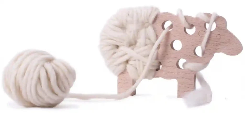 Das Holz-Fädelschaf ist ein kreatives Holzspielzeug, bei dem Kinder mit einem Wollknäuel durch vorgebohrte Löcher im Schaf fädeln können, um ein individuelles Design zu schaffen.